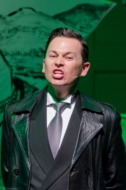 The strange odd couple worked so well together, the master of comedy timing Paul Buckle as the evangelist chiropodist Gilbert Chivers, and his wife Joyce played brilliantly by Cat Bailie showing star quality on every move, they were a force together and Paul’s chiropody scene was a special highlight. Mr Wormold, Kristian Zgorzelski, gave life to this character as the obsessive destroyer of illegal meat with brilliant timing. Other parts well played, Helen Windsor as Mother Dear and Lisa Grace as the Puppeteer of the cute pig Betty Blue Eyes who was raised illegally for a civic banquet to celebrate the Royal Wedding when all the rest of the town had spam.