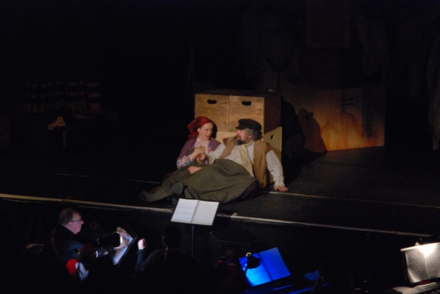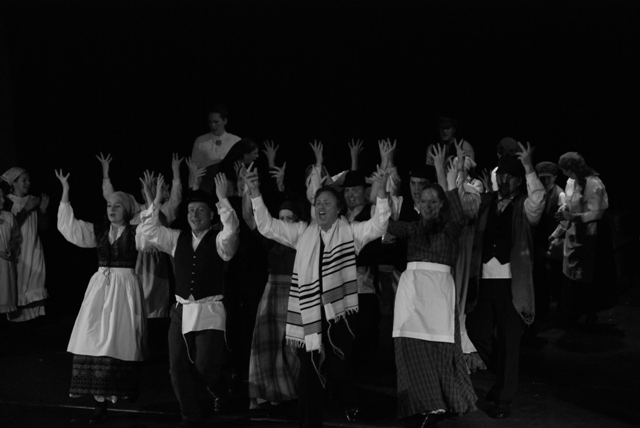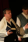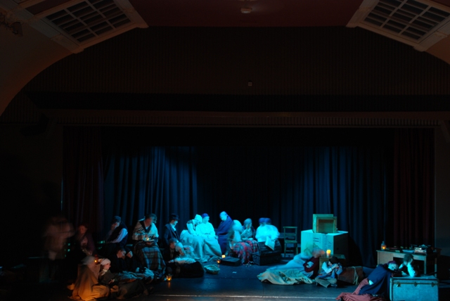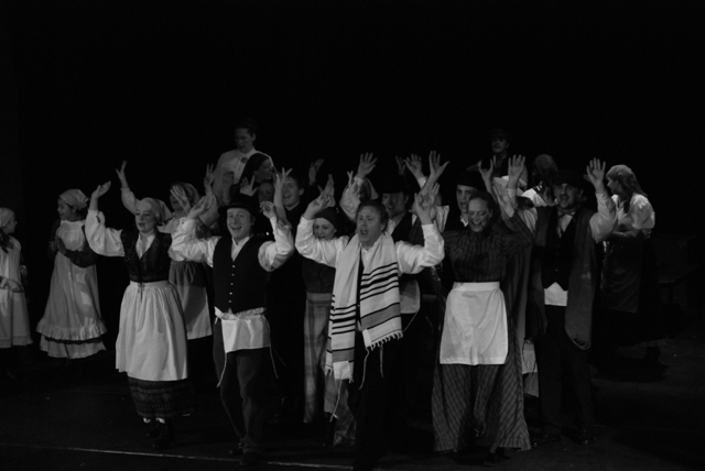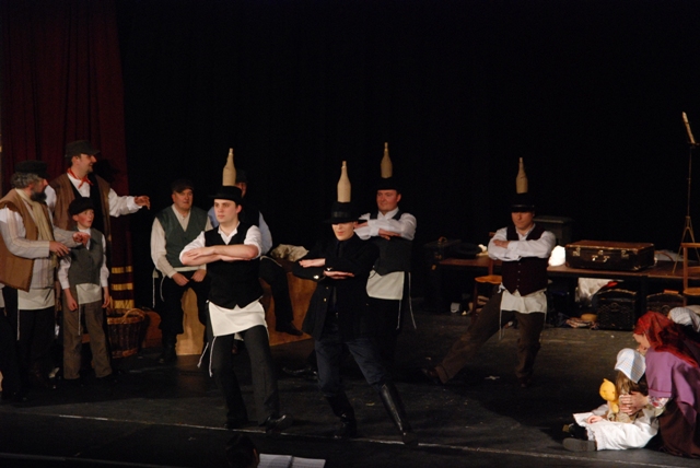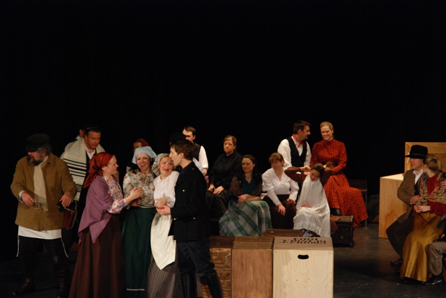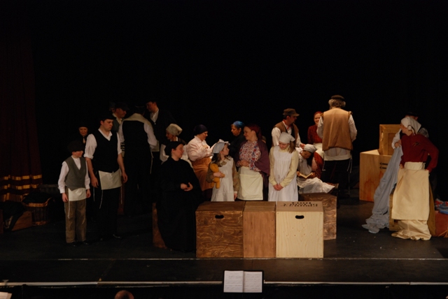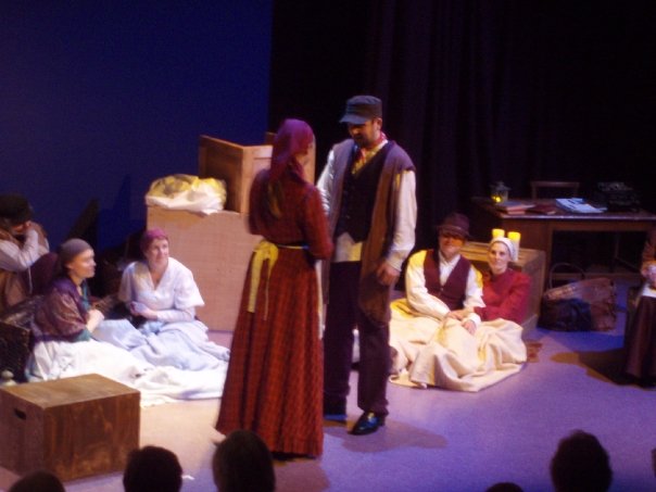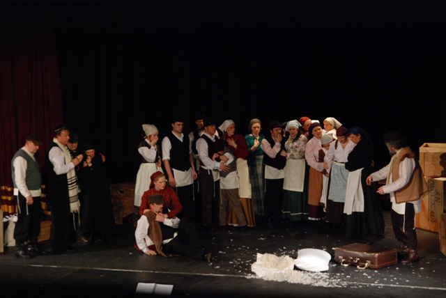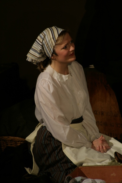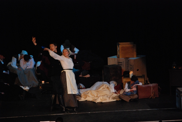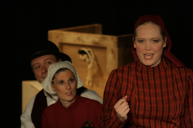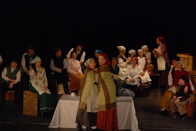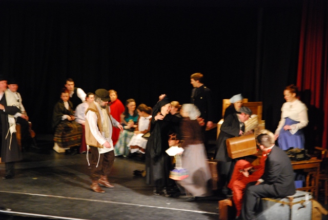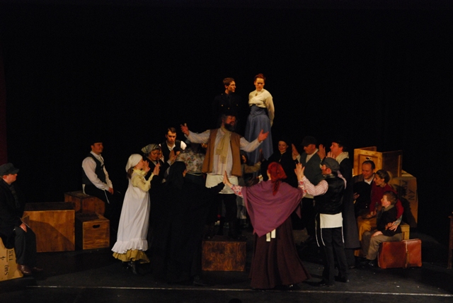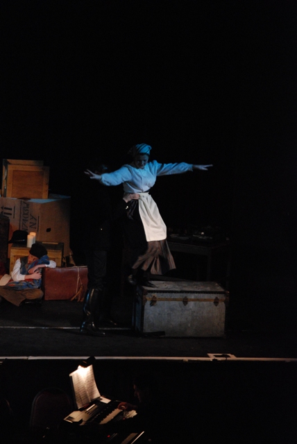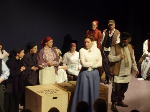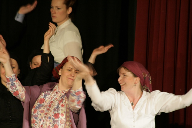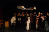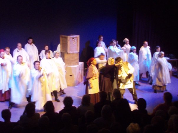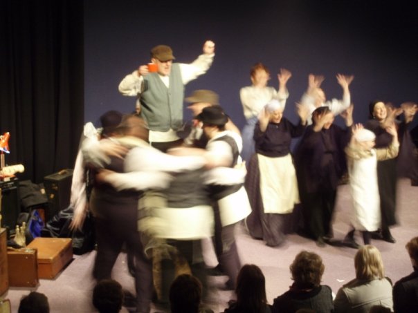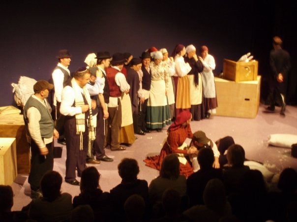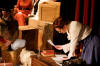 Our set designer Liz did a fantastic job in realising Paul's concepts of the waiting area of Ellis Island - lots of tea chests and packing crates were constructed, including a special set which created a pyramid of boxes from which Fruma Sarah magically appeared at the top with a gigantic white wedding dress cascading down for the nightmare sequence.