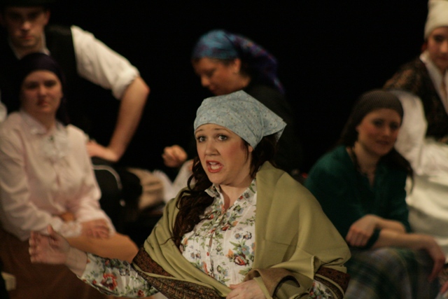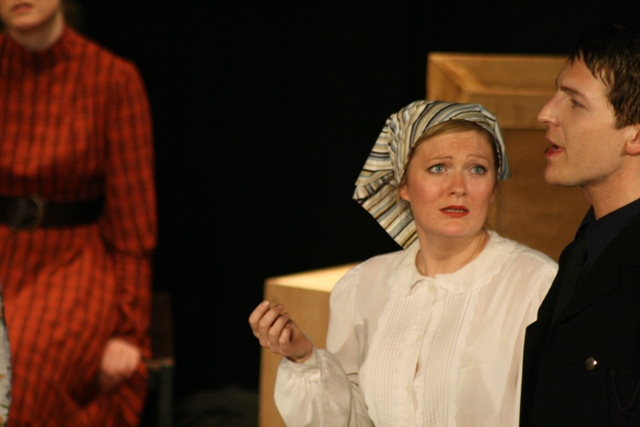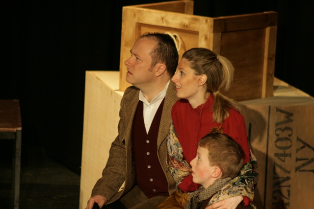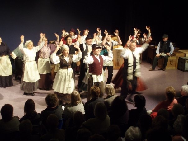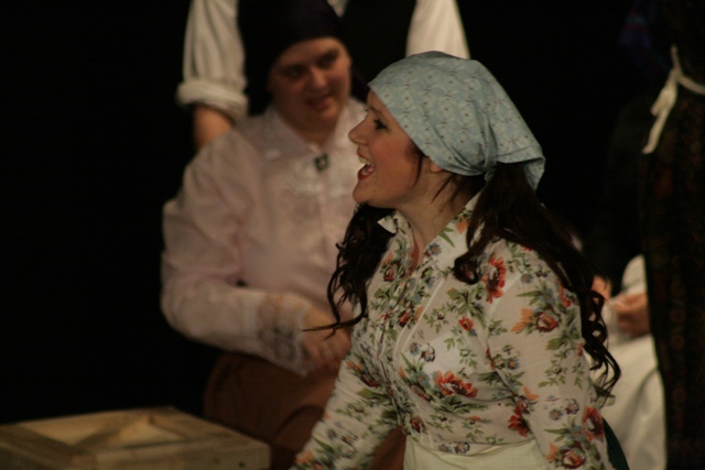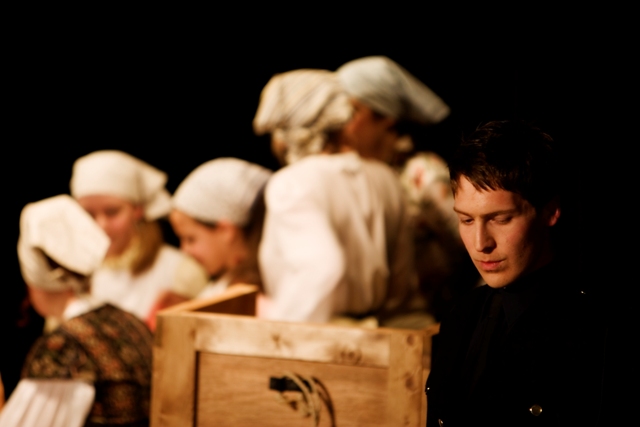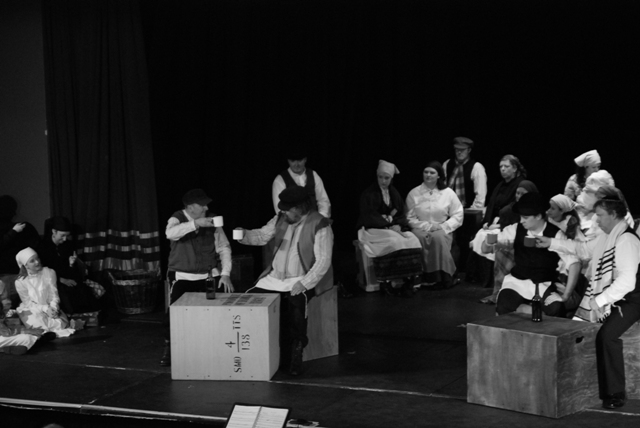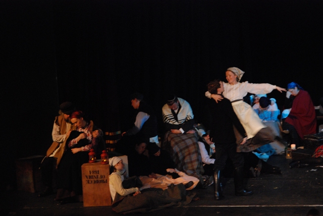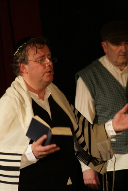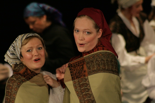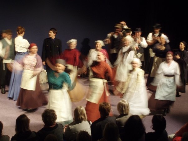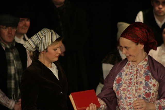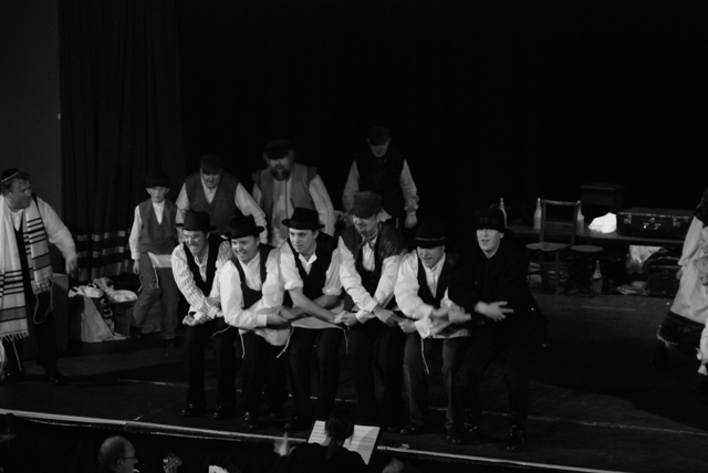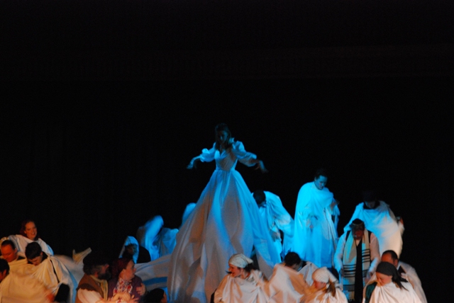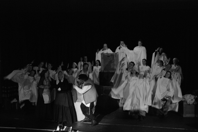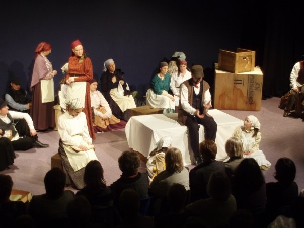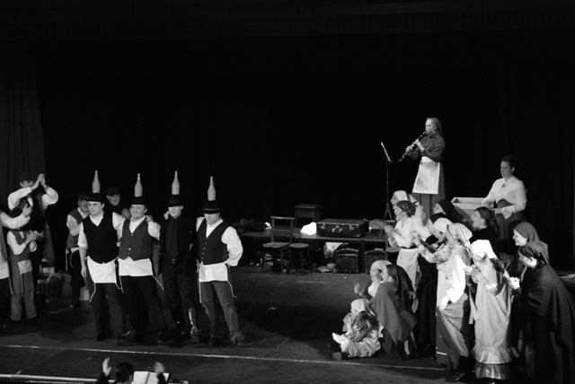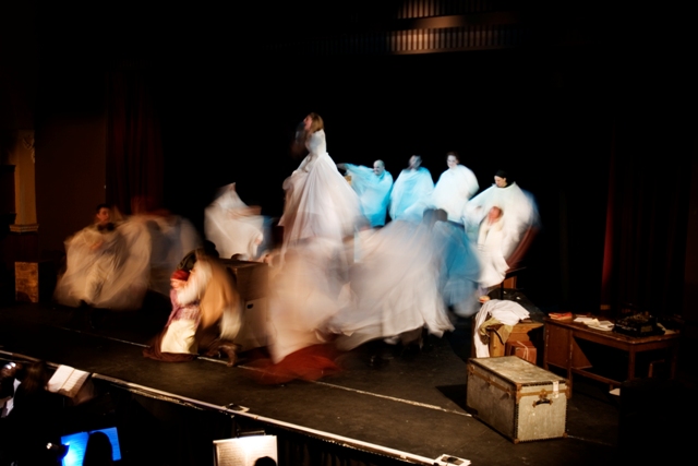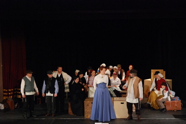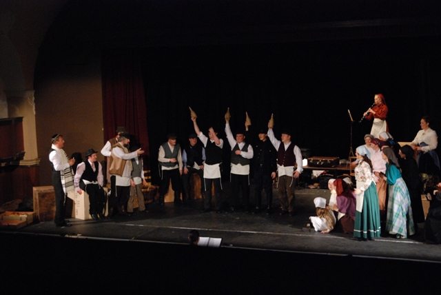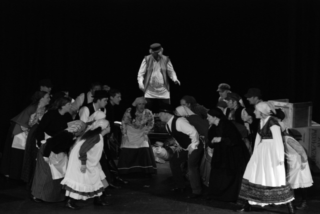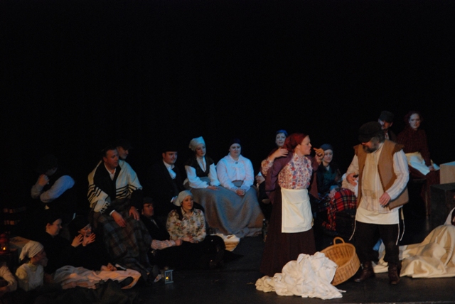 Our set designer Liz did a fantastic job in realising Paul's concepts of the waiting area of Ellis Island - lots of tea chests and packing crates were constructed, including a special set which created a pyramid of boxes from which Fruma Sarah magically appeared at the top with a gigantic white wedding dress cascading down for the nightmare sequence.
