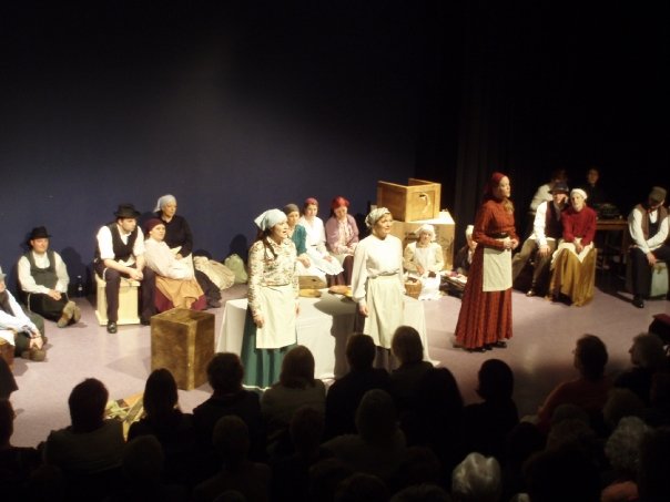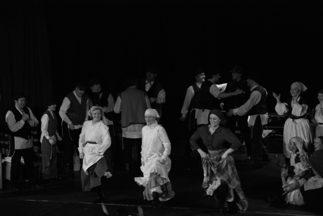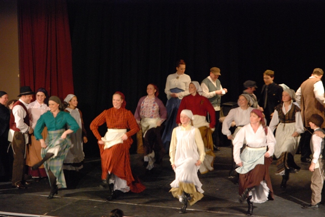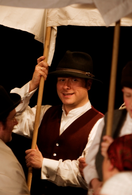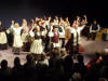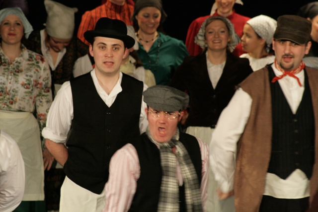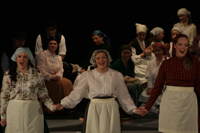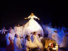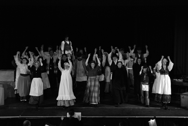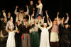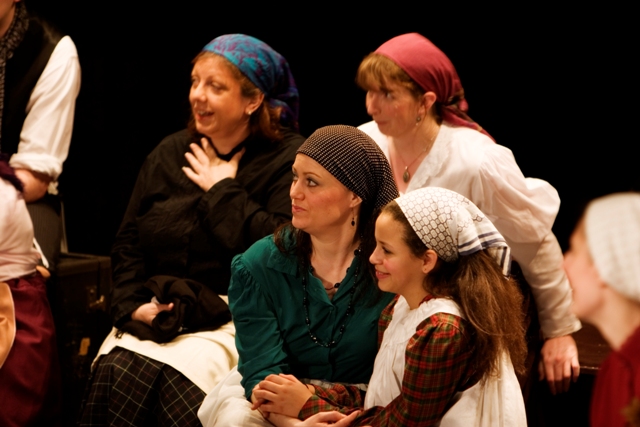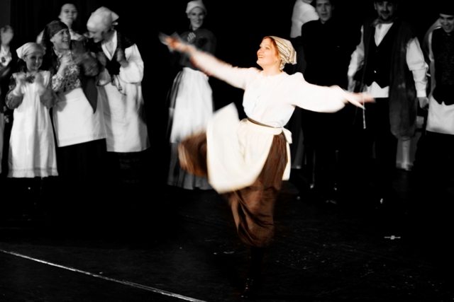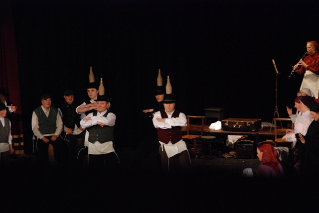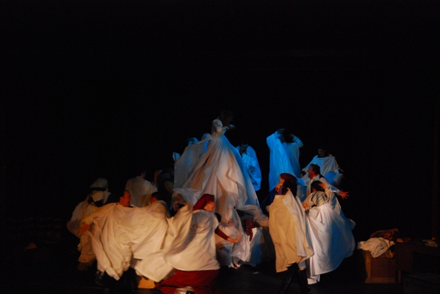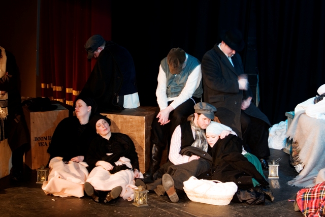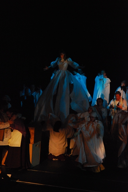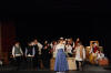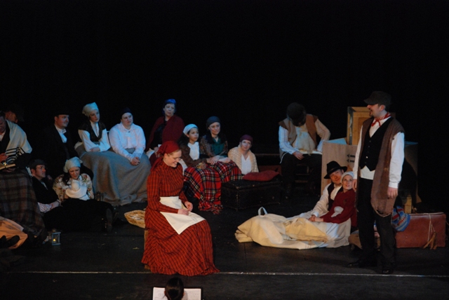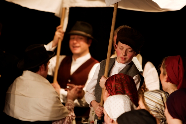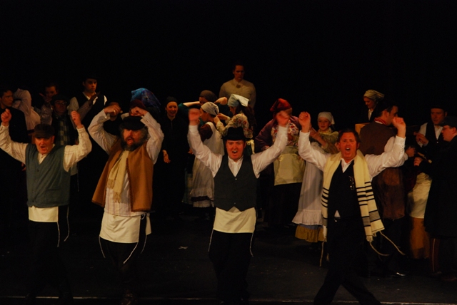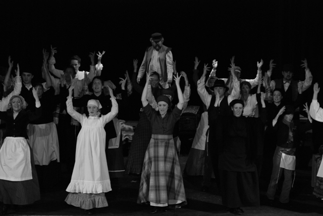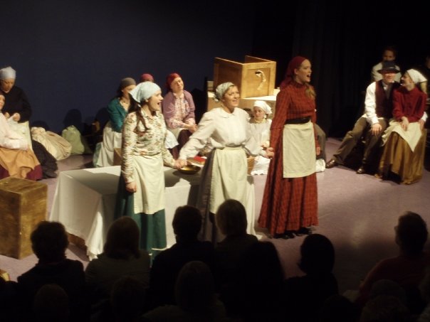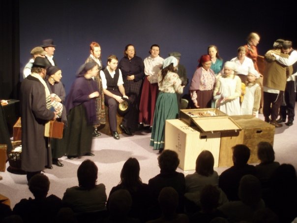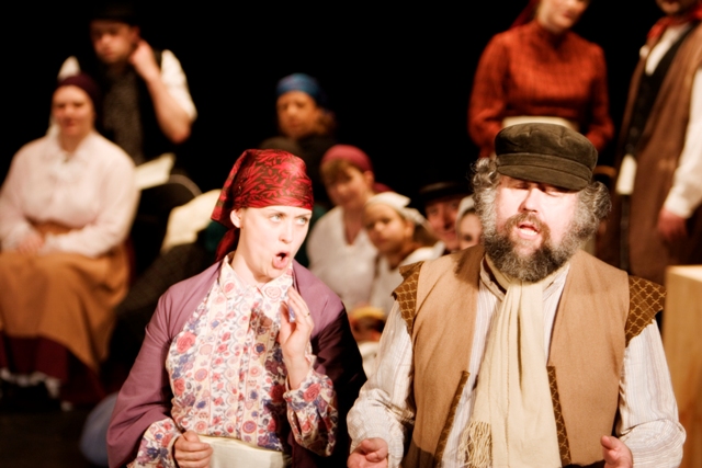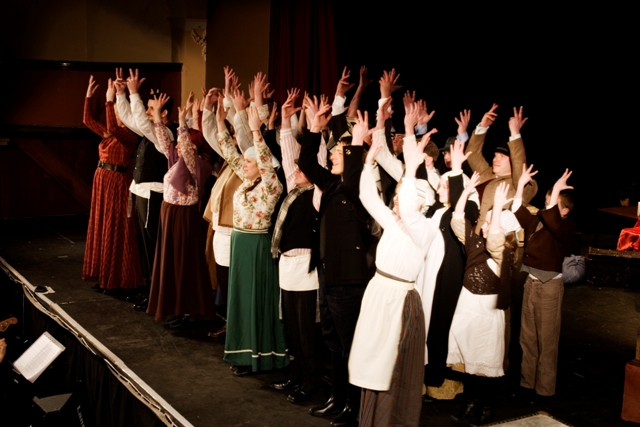 Our set designer Liz did a fantastic job in realising Paul's concepts of the waiting area of Ellis Island - lots of tea chests and packing crates were constructed, including a special set which created a pyramid of boxes from which Fruma Sarah magically appeared at the top with a gigantic white wedding dress cascading down for the nightmare sequence.
